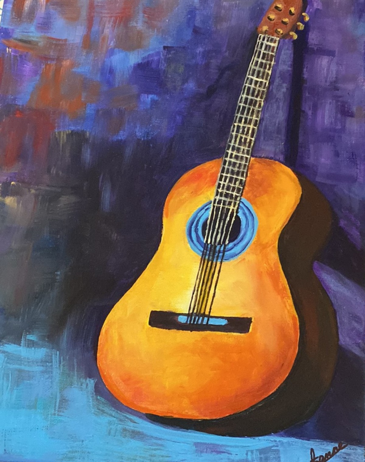 Tableau peint à acrylique sur toile coton représentant une guitare debout dans un coin de la pièce. Finition vernis satiné. Bords peints en continuité. Envoi sécurisé, bien emballé avec bulles et carton, frais de port gratuit. Tous mes tableaux sont signés avec un certificat.