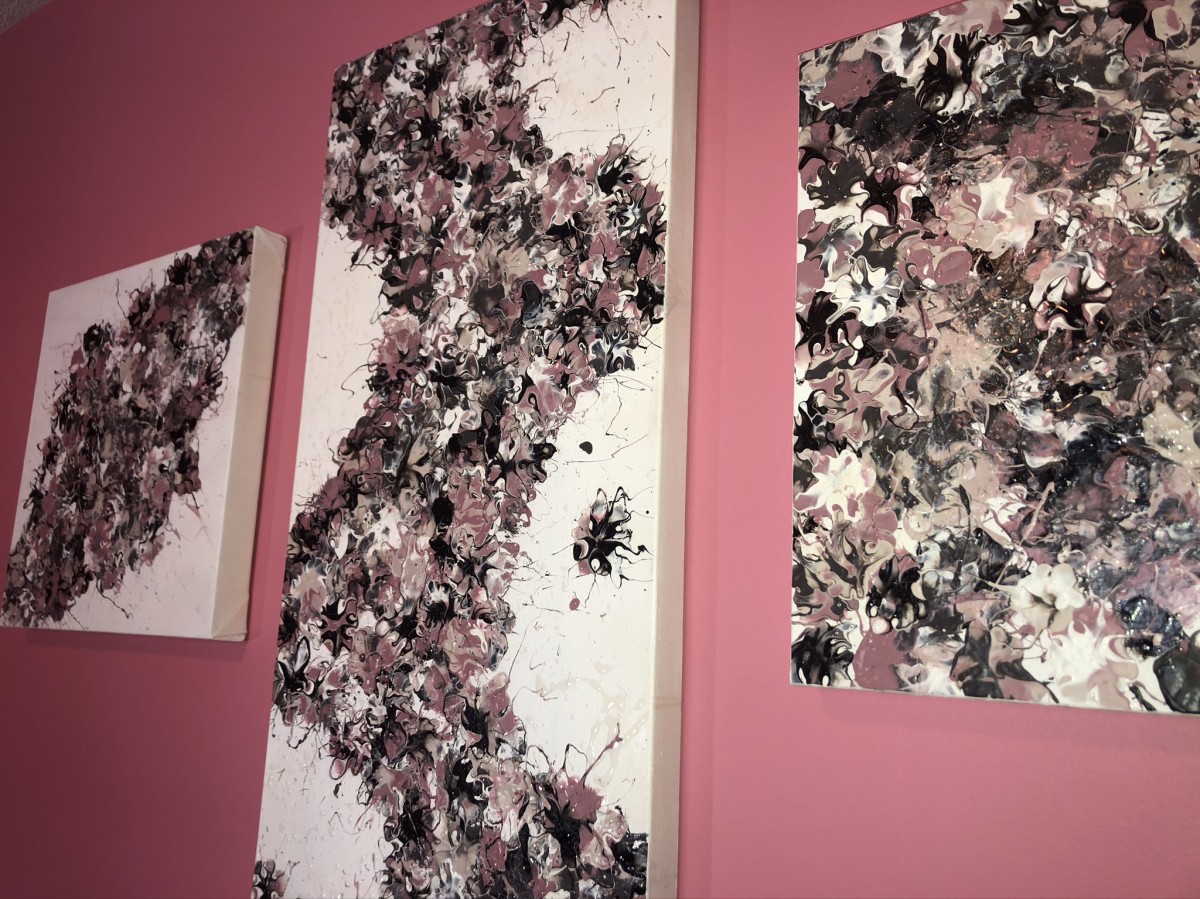 3 toiles de couleurs rose, grise, noir et blanc. Splash de couleurs. Des fleurs magiques.