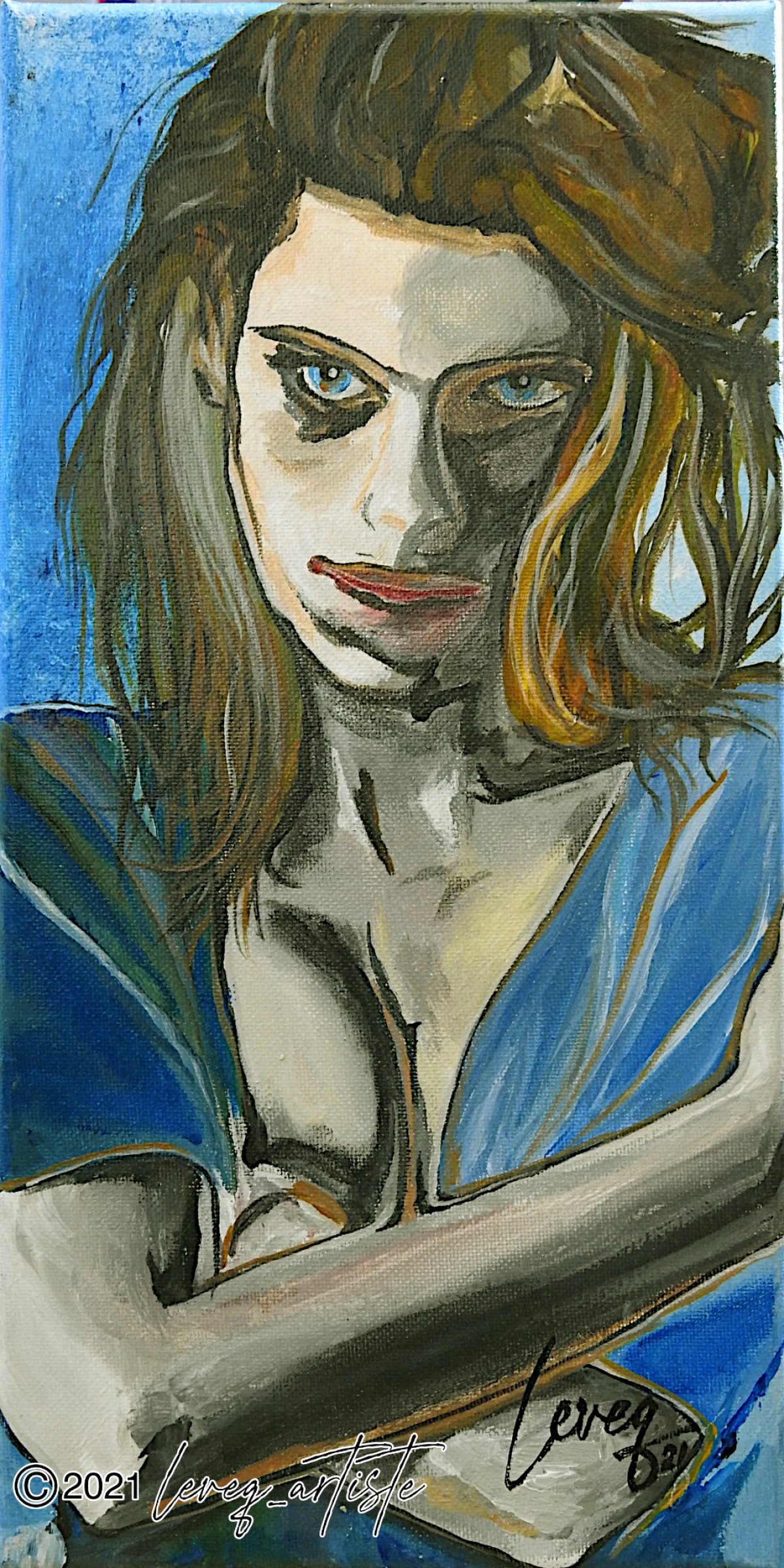 Ses cheveux, peints dans des tons chauds de brun et d'orange, encadrent son visage dans une cascade de couleurs riches qui ajoute du mouvement et de la vitalité à l'œuvre. L'expression dramatique capturée dans ses yeux et ses traits du visage invite les spectateurs à approfondir le récit de la résilience et de l'autonomisation. L'utilisation du bleu non seulement renforce l'impact visuel, mais symbolise également la confiance, la loyauté et la vérité, tout en transmettant un lien avec le bien-être et la spiritualité.