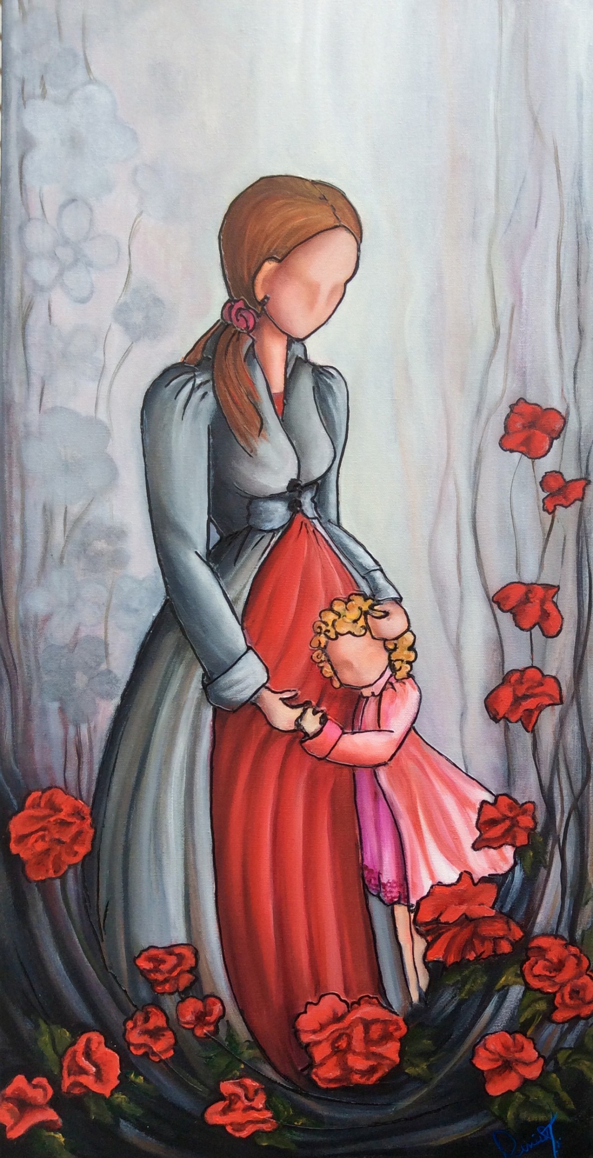 Mère avec sa petite fille dans un jardin de fleurs rouges.