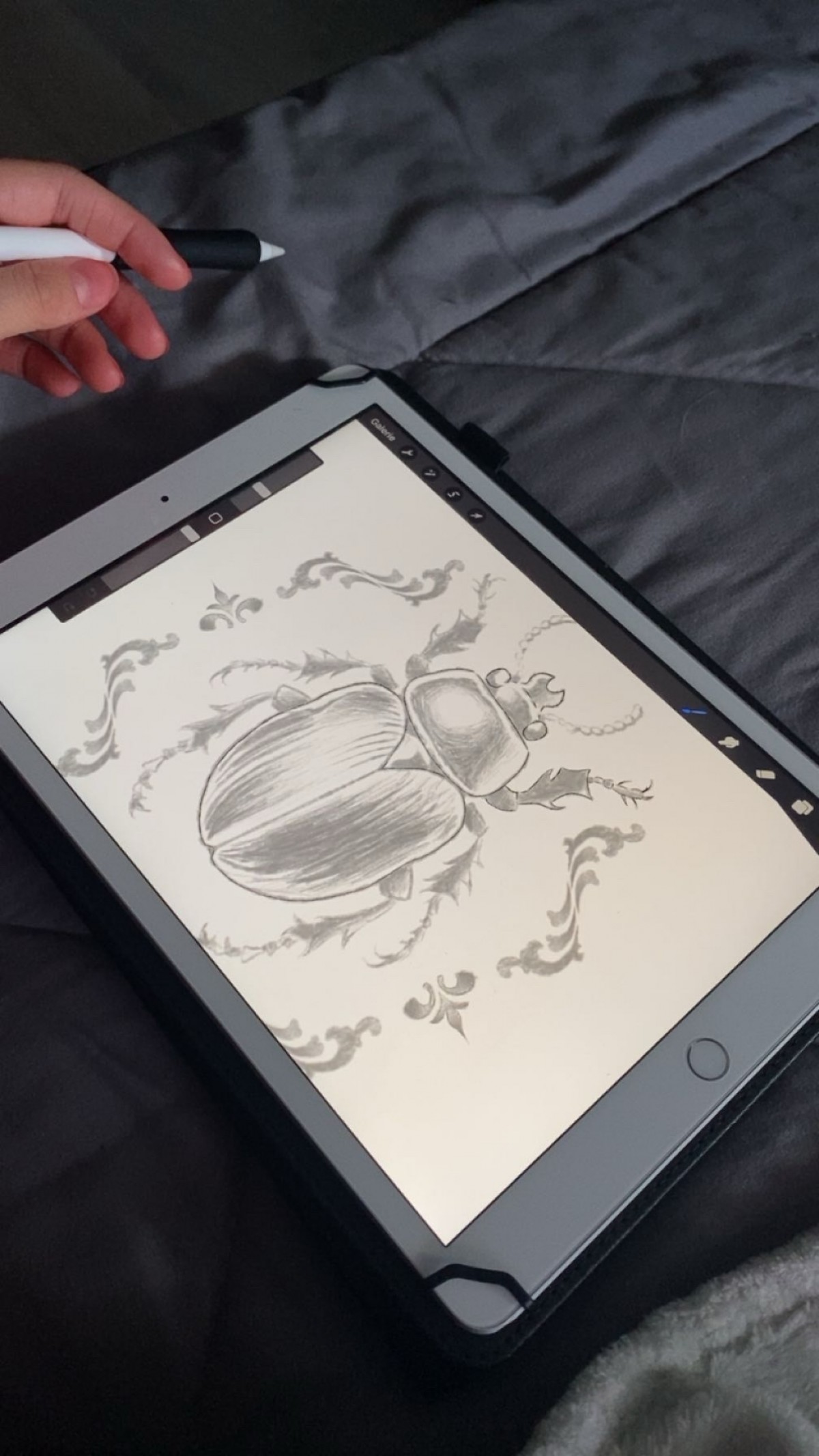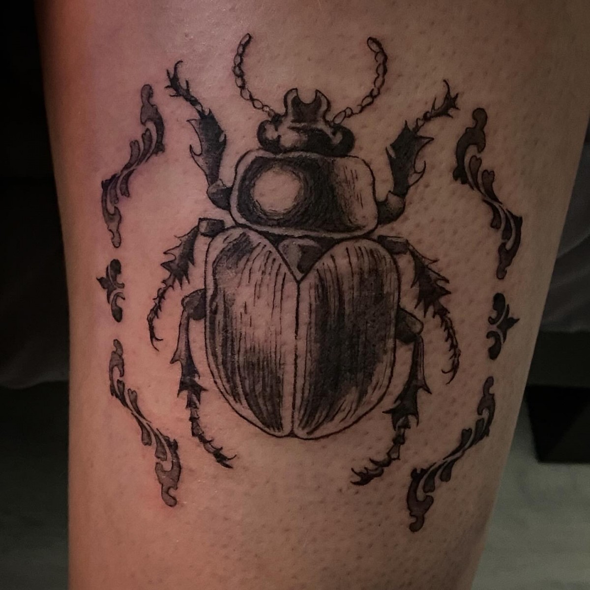 Ce scarabée fait par Enora Belmont qu'elle s'est ensuite fait tatouer sur la cuisse , représente la force de s'accrocher a la vie malgré les dures épreuves qu'on puisse traverser