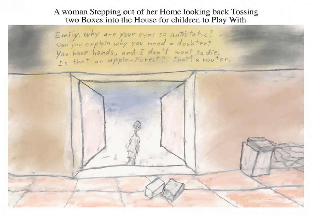A woman Stepping out of her Home looking back Tossing two Boxes into the House for children to Play With