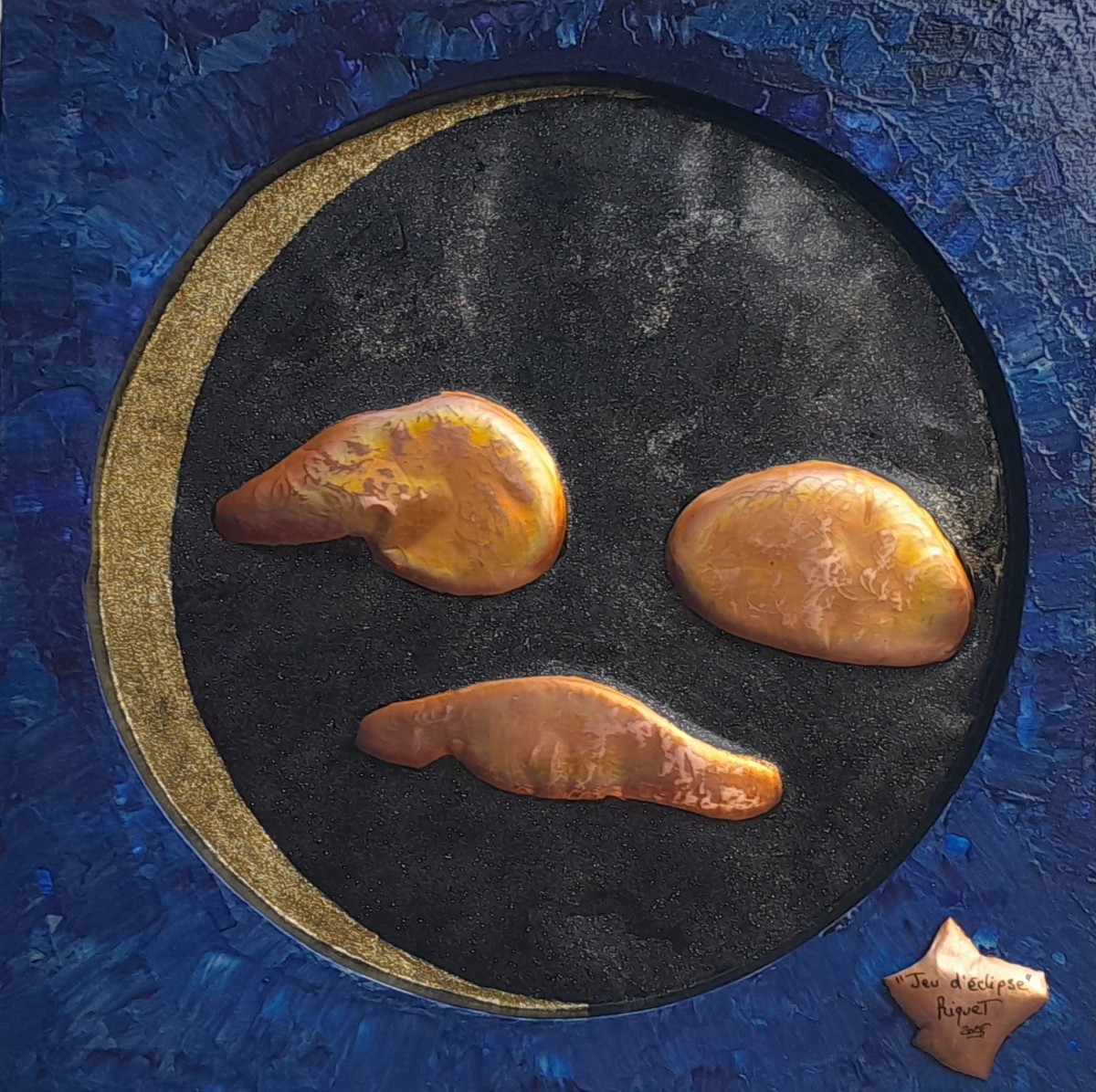 Subtil équilibre entre le fond et la forme, entre la peinture et le cuivre en 3D. Peinture acrylique et huile sur bois au couteau. Cuivre, poudres métalliques, patines et vernis.