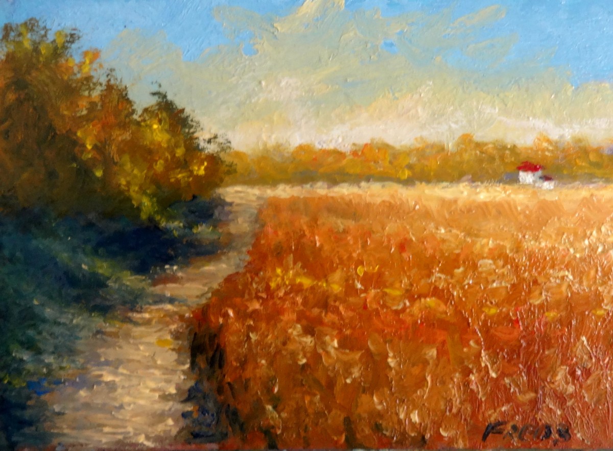 Tuscan wheat field in the summer sun. Original miniature oil painting on treated 140 lb cold press paper sealed against fading and dust.