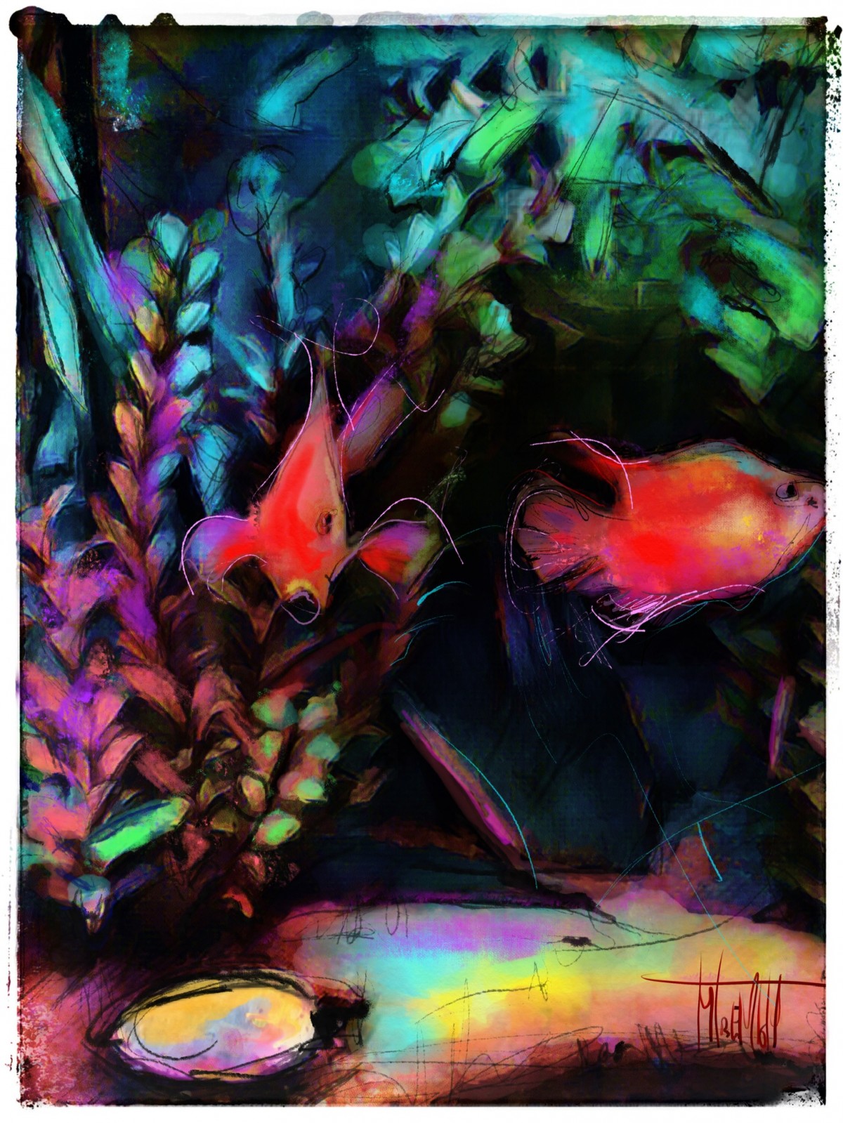Cette oeuvre figurative et contemporaine a été réalisé à partir d’une toile peinte à l’acrylique, d’une photo et d’une oeuvre numérique. C’est par ces trois mondes combiné qu’elle a pris naissance et au milieu de cet univers, les couleurs se sont imposés d’elles-même. Photo prise chez un ami de son aquarium.
