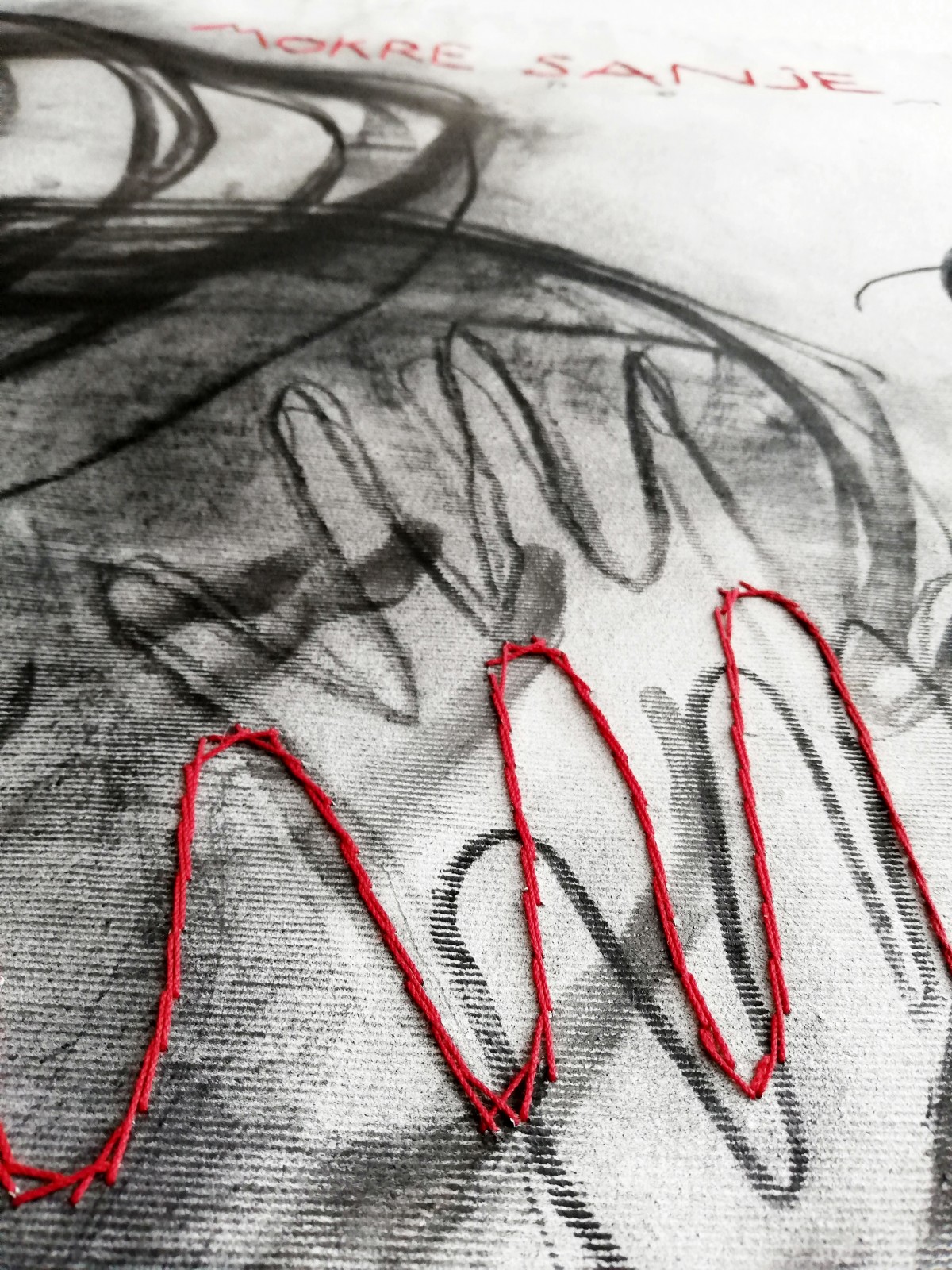 Painting on a canvas sheet, Acrylic, charchoal and red thread.