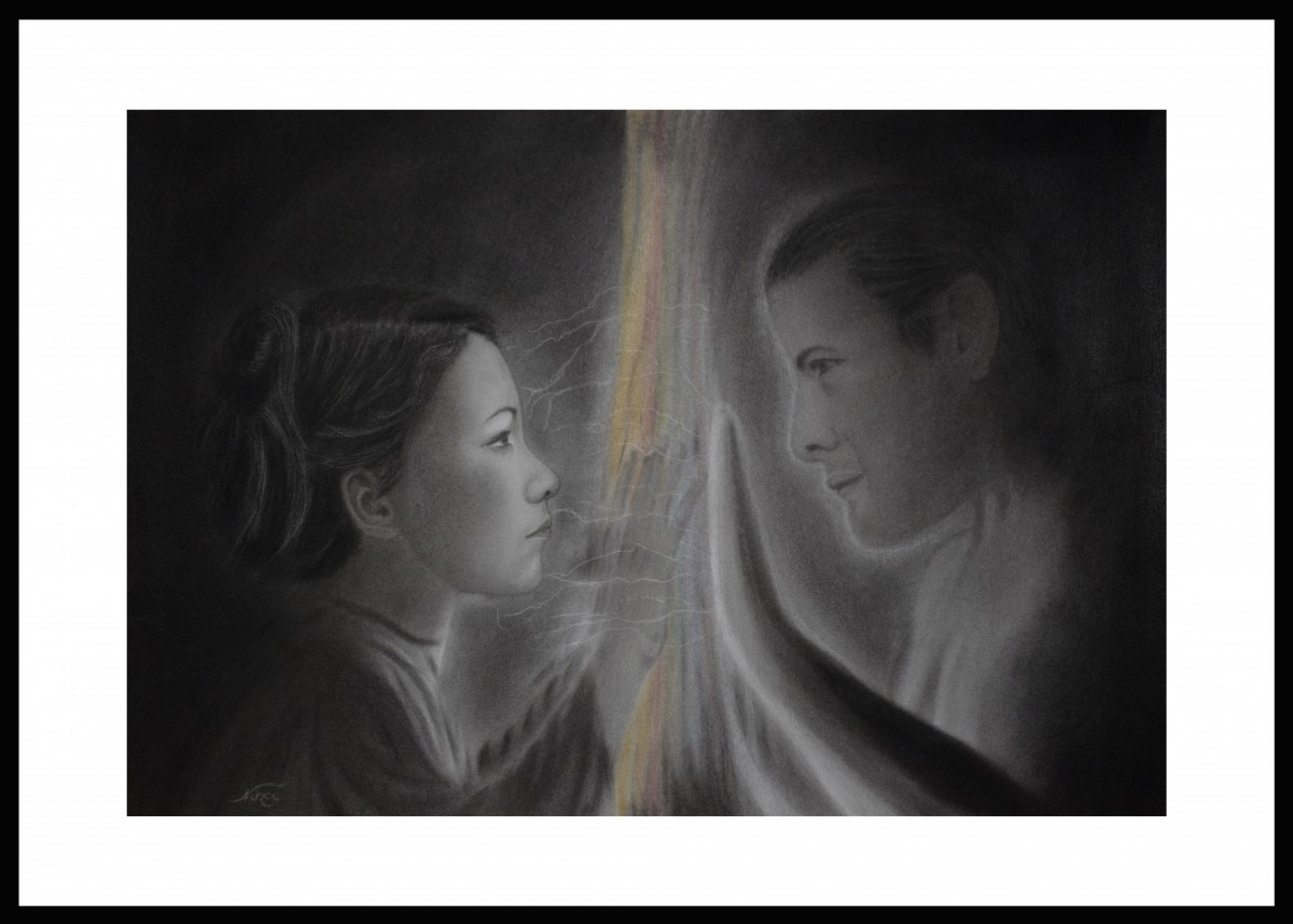 Poudre de carbone et de pastels sur papier Canson. Une femme et un homme séparé par un voile fluide et multicolore symbolisant la séparation par la mort physique. Elle est dans un corps incarné, lui n'étant plus incarné son corps est moins matériel, estompé mais dégageant de la lumière-énergie qui passe au travers du voile. Leurs mains se joignent sur le voile, les yeux dans les yeux.