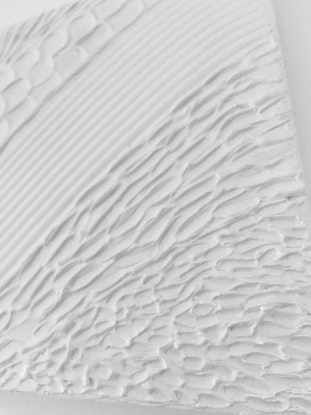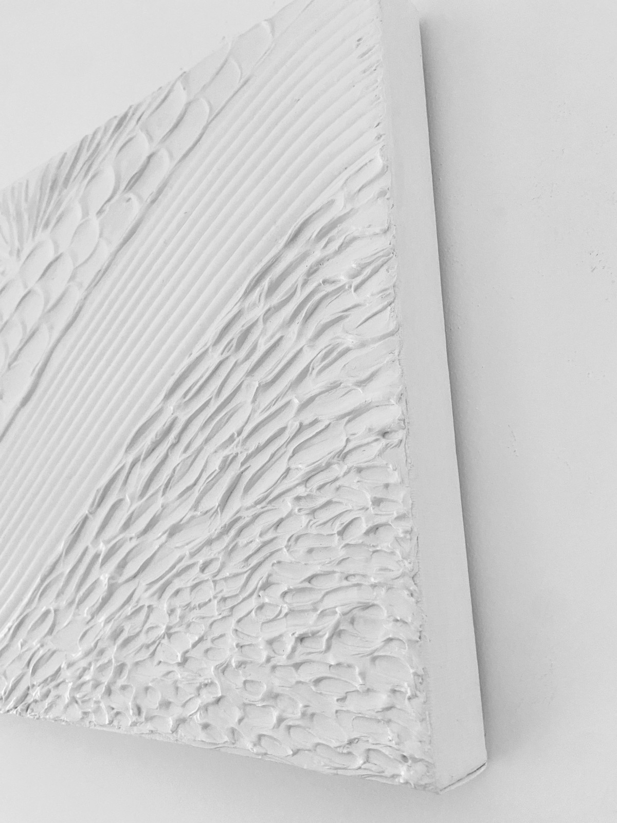 "Silent Harmony" is a 29x29 cm work, in pure white, which evokes the tranquility and serenity of a Zen garden. In the center of the canvas, a path with clean and delicate lines extends, symbolizing a path of inner peace. This path, sculpted in relief, seems to guide the viewer's eye through a minimalist landscape, where each curve and each angle are designed to establish a perfect balance. The dazzling whiteness of the work reflects the purity of the moment, an invitation to meditation and contemplation. The work seems to breathe absolute tranquility, where the absence of colors and the purity of white encourage introspection and harmony.