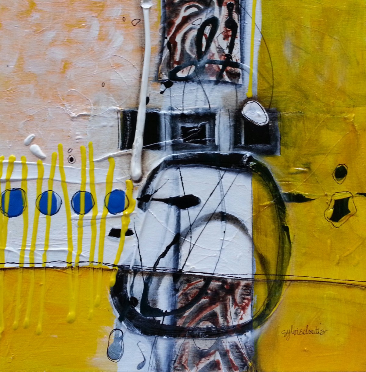 Techniques mixtes sur panneau de bois avec pièce de toile collée.