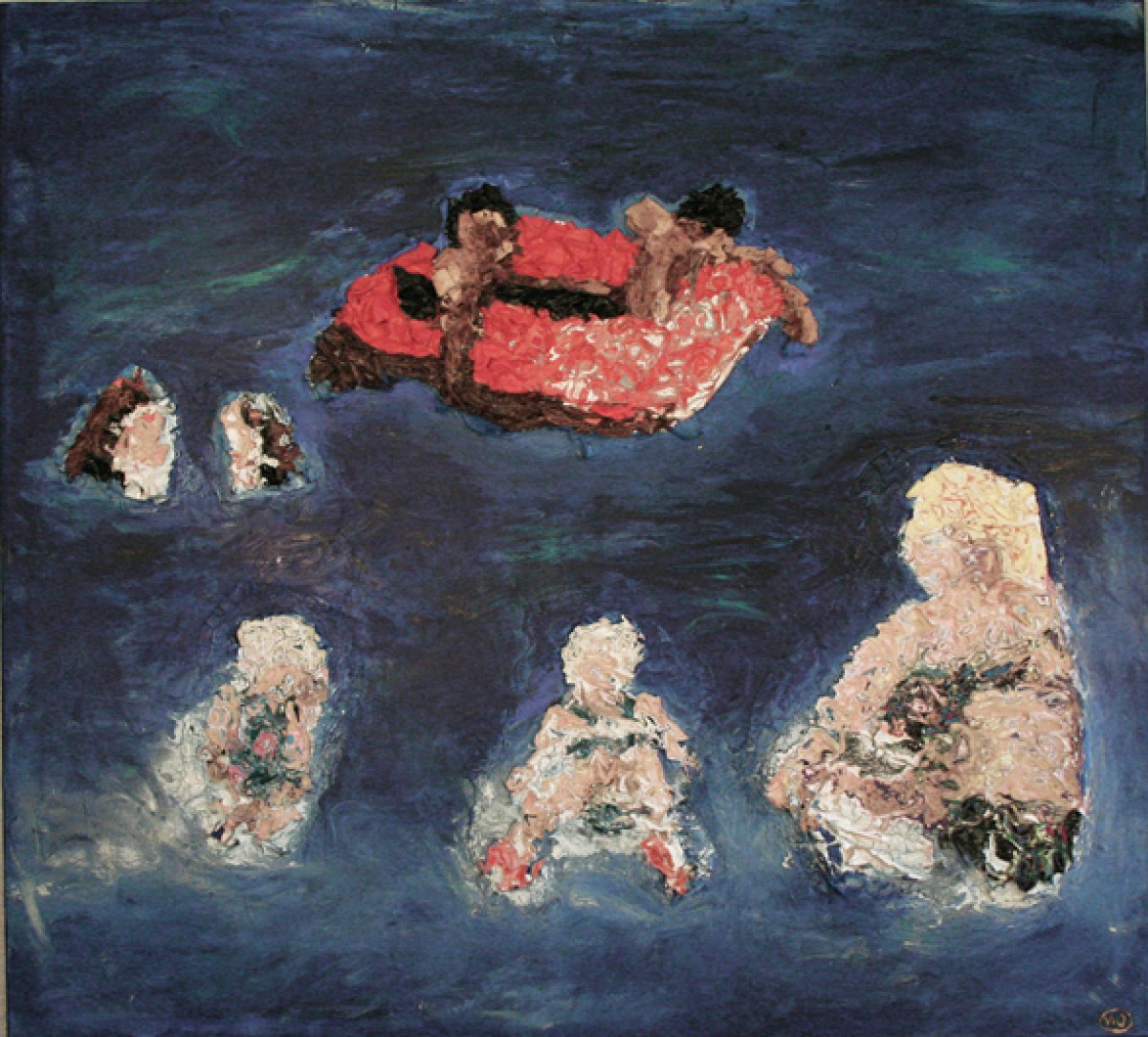 Human body is modeled with canvas and acrylic-lacquer paint. I then cut the layered mass.
