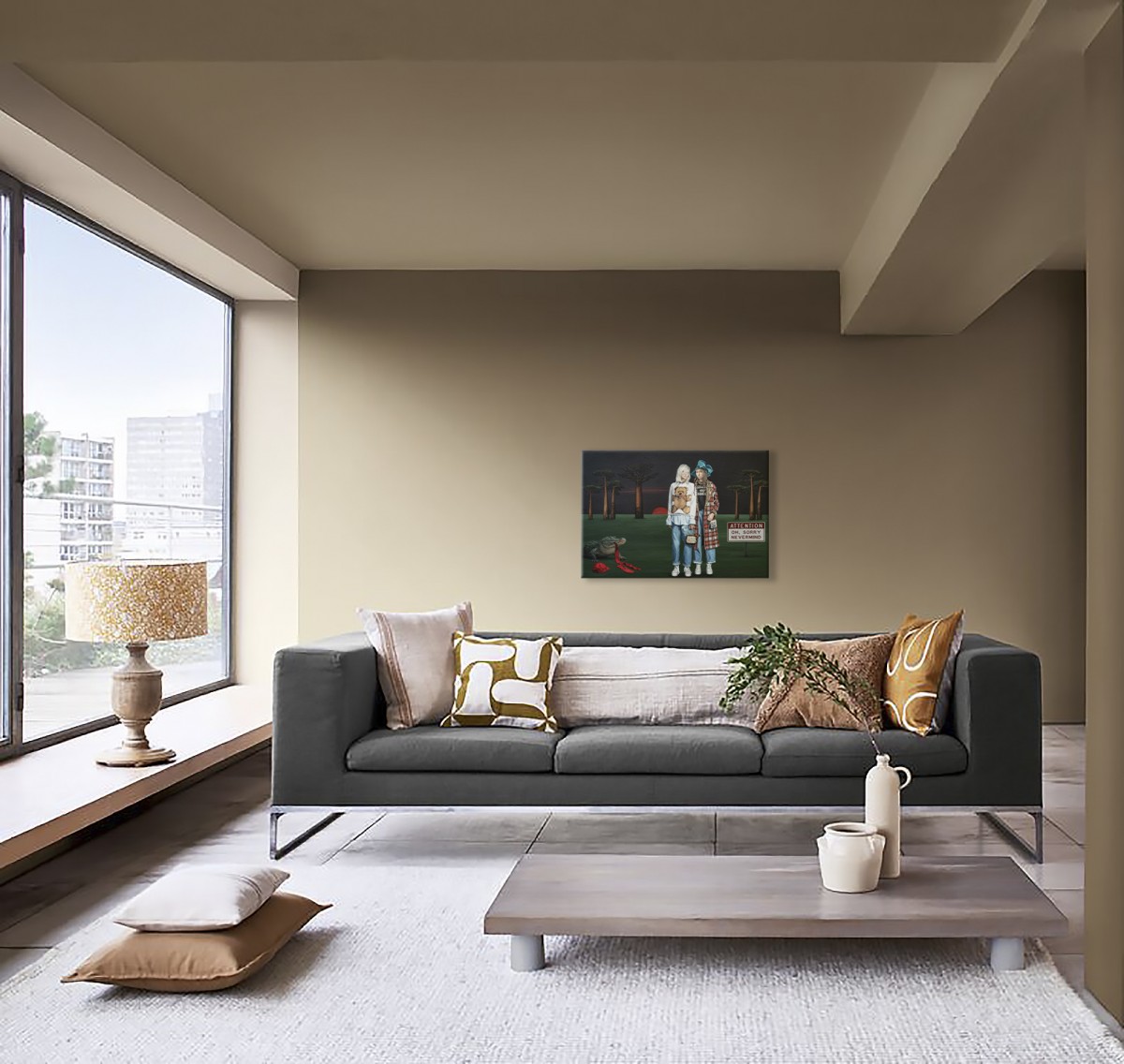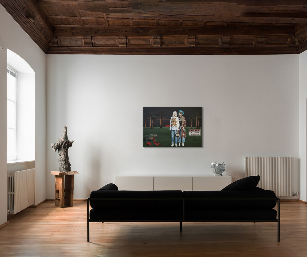 Step into a realm where youthful confidence meets untamed nature and quiet symbolism. Two fashion-forward figures stand beneath a darkening sky, framed by ancient baobabs and the fading red of sunset. Their playful attire — teddy-bear sweater, plaid coat, oversized turquoise bow — contrasts with a crocodile creeping in with a scarlet ribbon in its jaws. Nearby, a red cap and tie rest on the ground — subtle relics of power, hinting at political theatre and the myths it creates. The ironic sign “ATTENTION OH, SORRY NEVERMIND” transforms the scene into a surreal allegory on leadership, illusion, and collective forgetfulness.