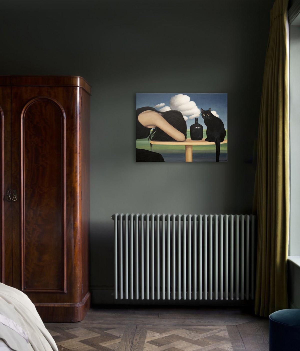 This lifestyle art piece is ideal for creating pleasant moments in your interior. This modern portrait of a black cat and young woman is ready to ship, signed and with a certificate of authenticity.